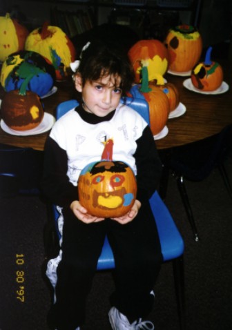 Her daughter, little scooby, at Halloween time holding a pumpkin